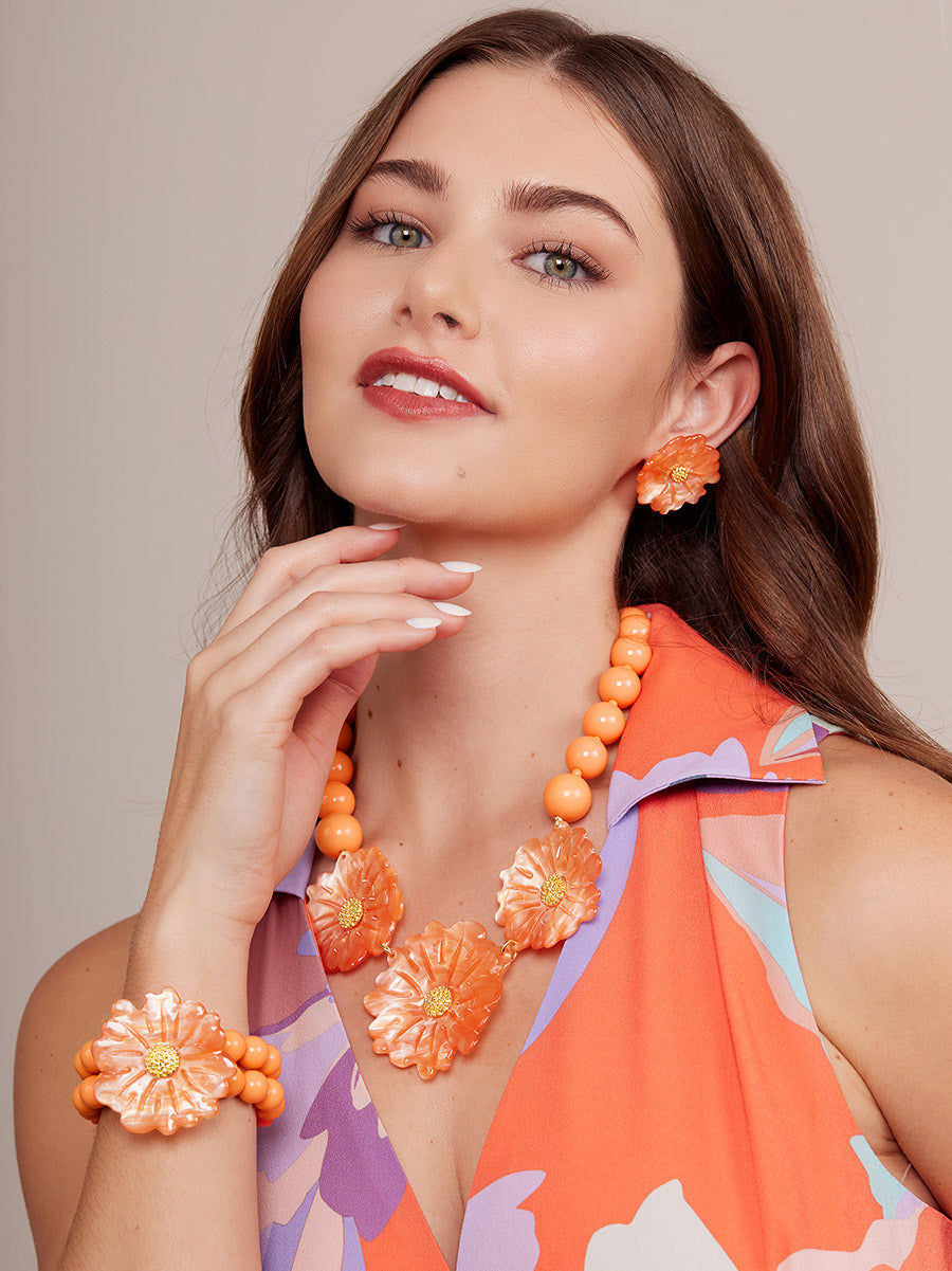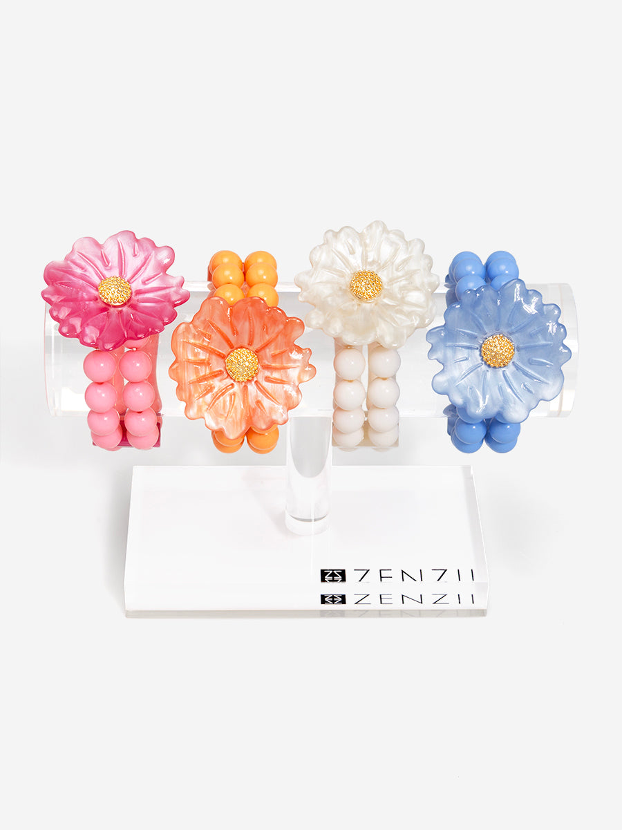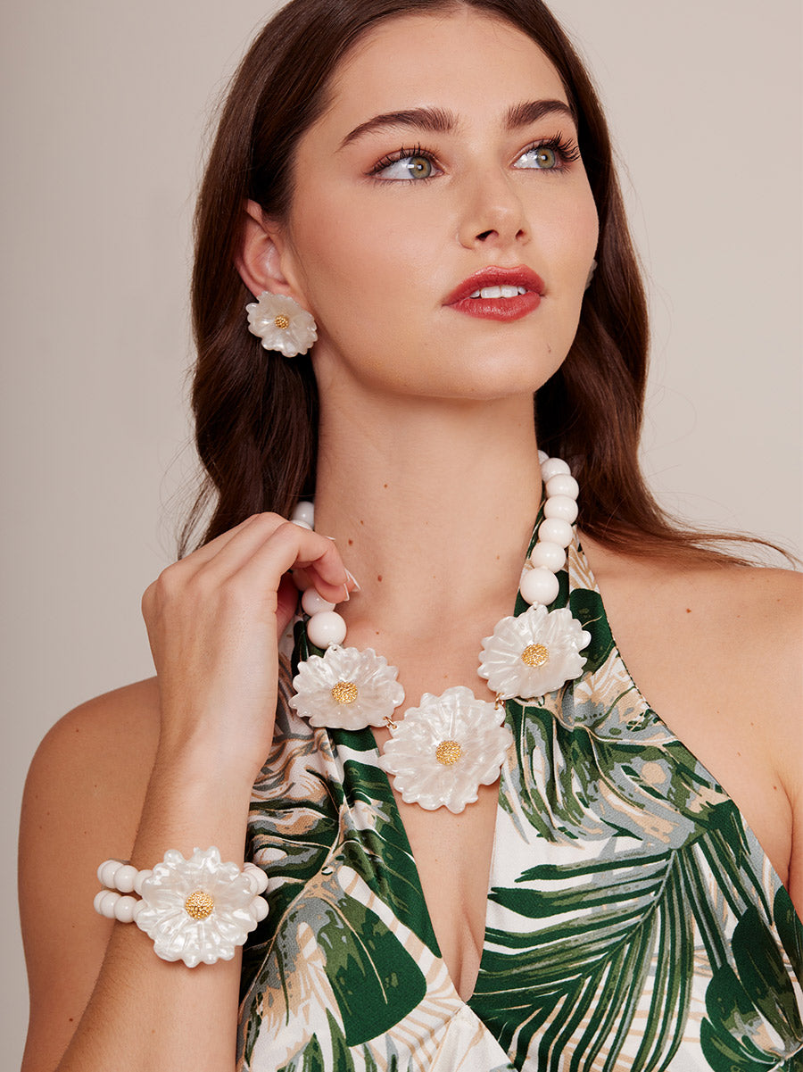 A stretch double band beaded bracelet finished with a sculpted statement daisy.