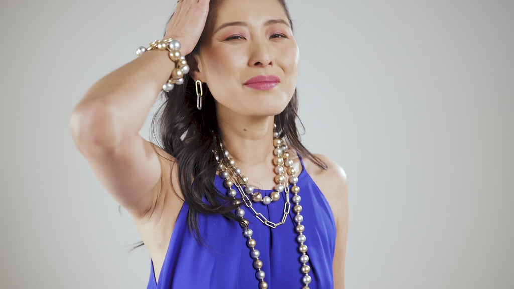 Long necklace composed of matte resin beads and a matte gold-tone ring with fabric tassel pendant. This style comes in all matte gold, all matte silver and alternating matte gold and matte silver beads.