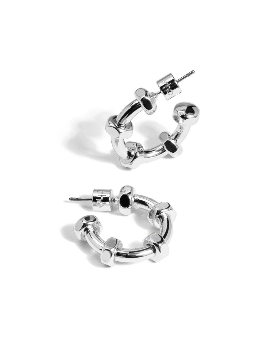 Hoop earring with raised bolt details for a playful industrial twist.