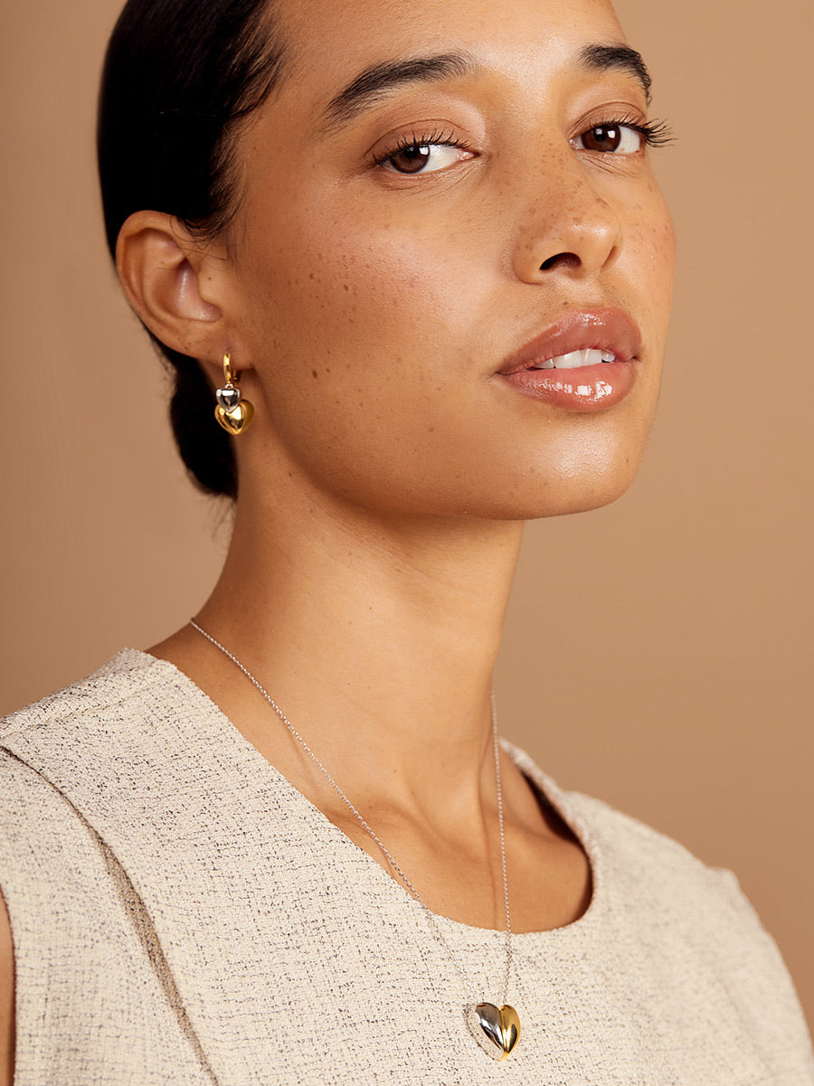 A polished gold-tone huggie anchors two swinging hearts—one golden, one silver—for a playful two-tone twist.