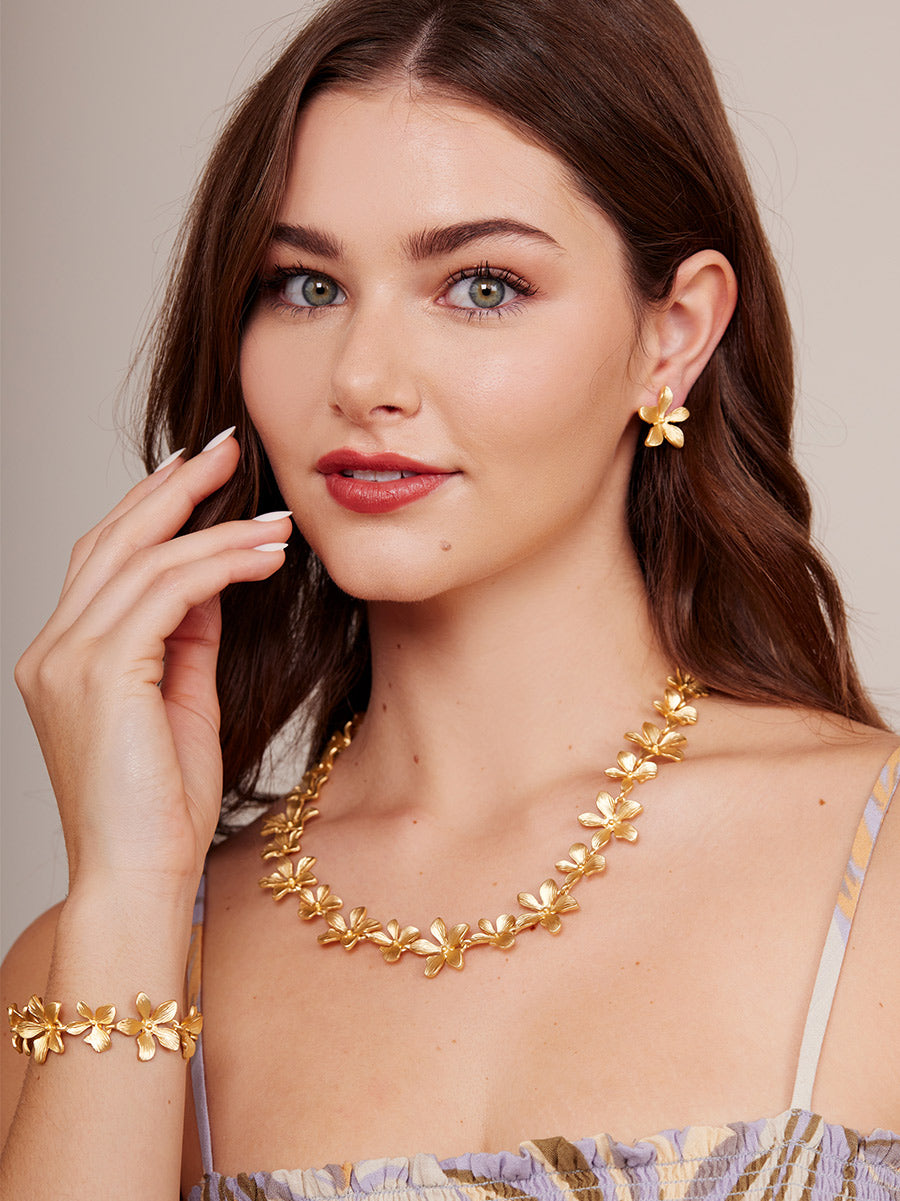 A matte gold bracelet accented with sculpted floral motifs and finished with an easy magnetic clasp.