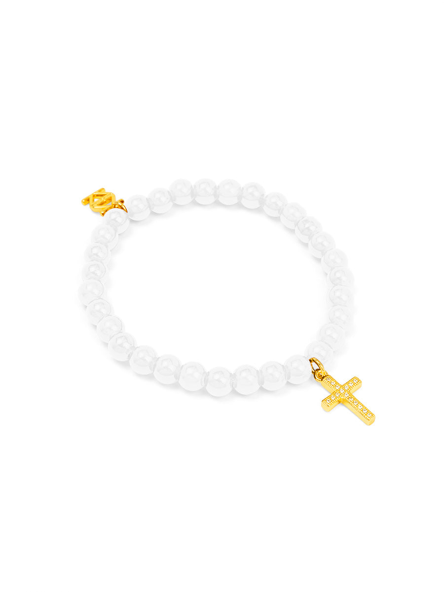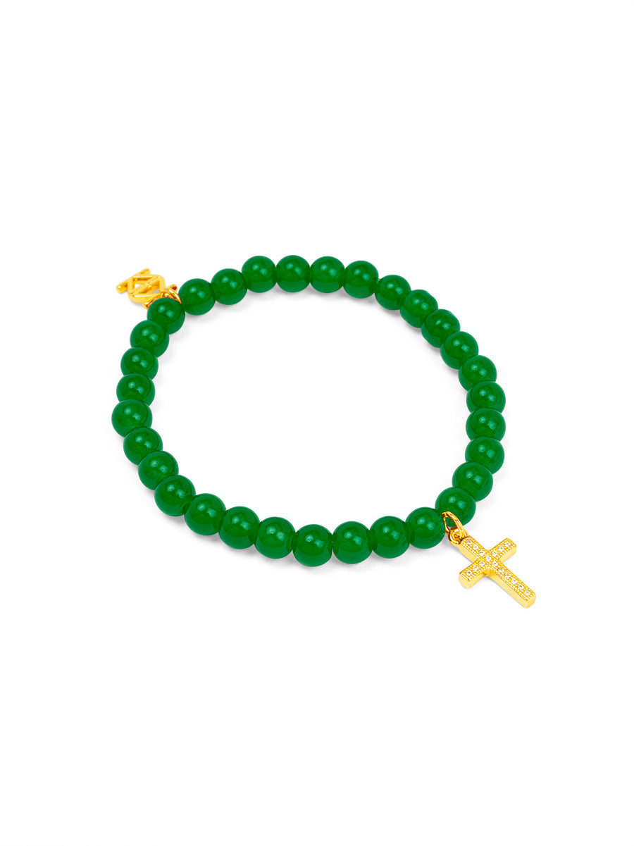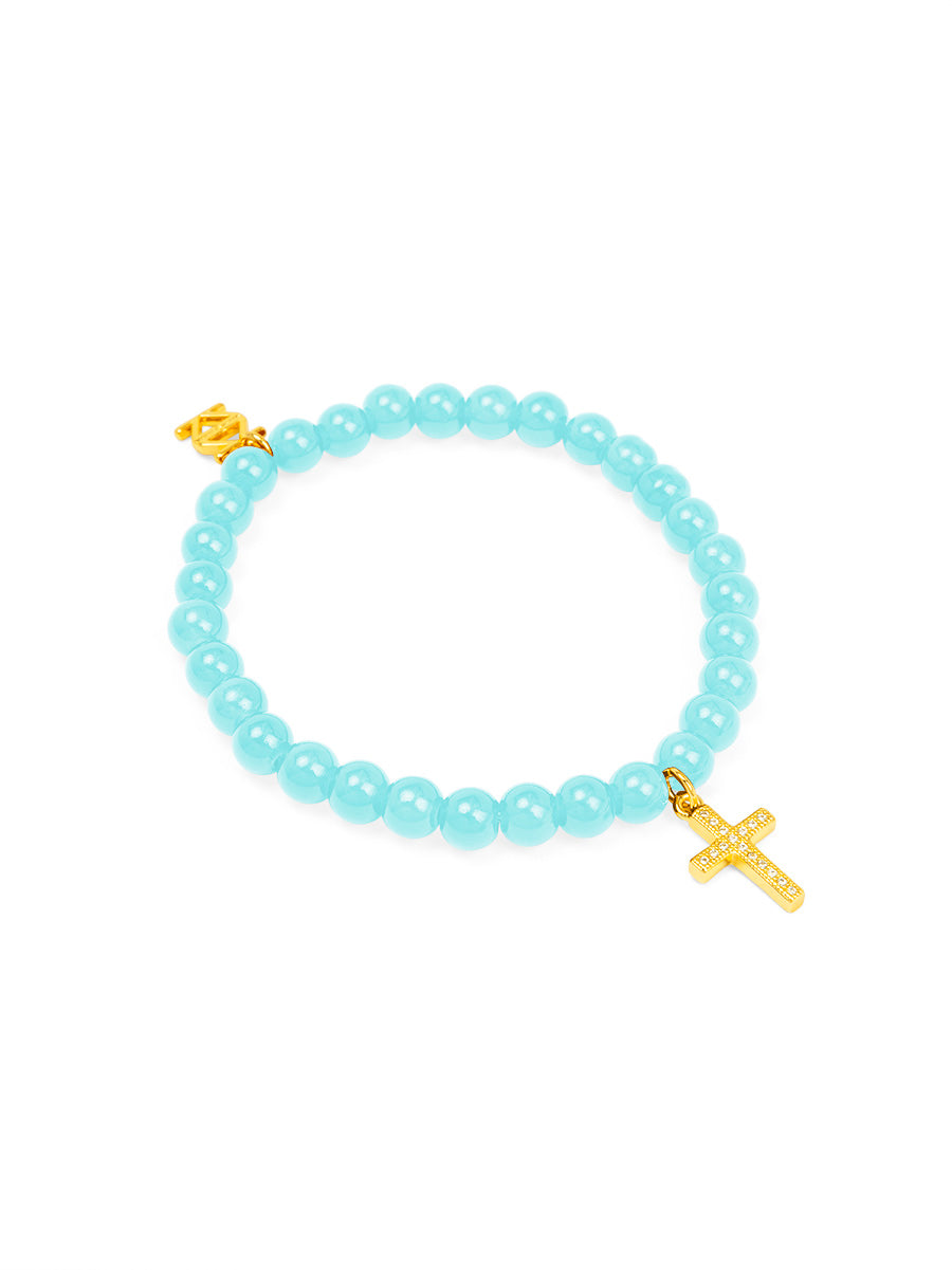 A stretch glass-bead bracelet accented with a small pavé cross charm.