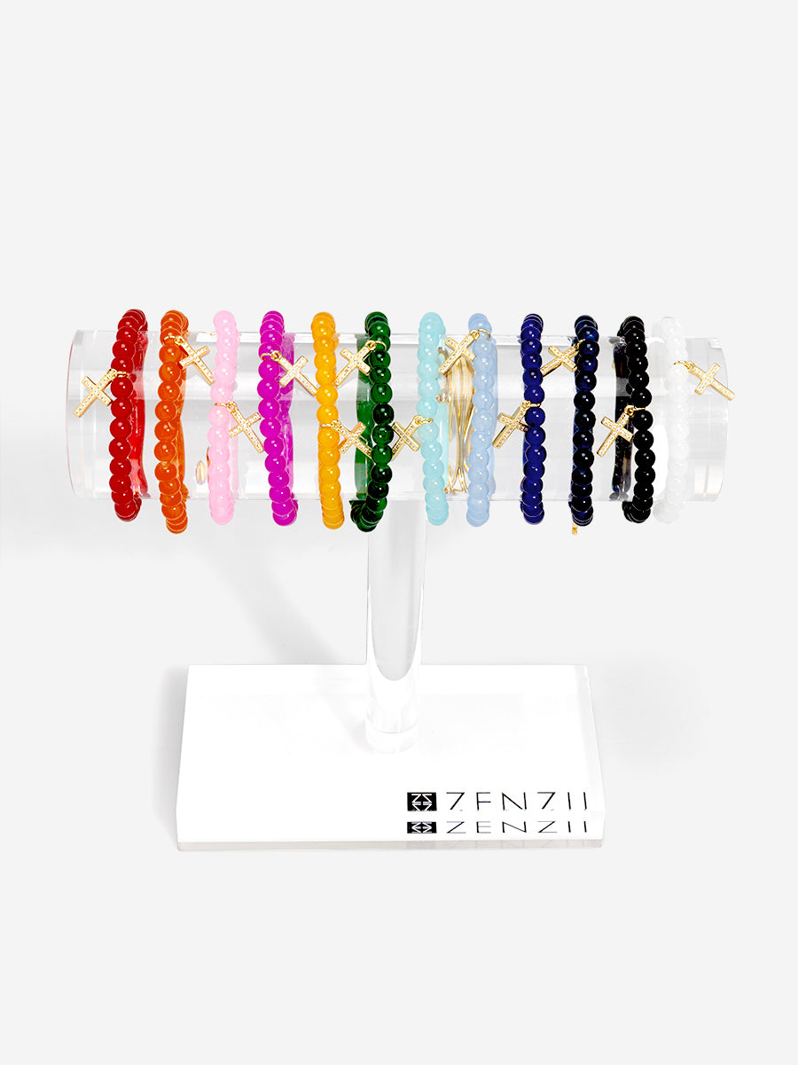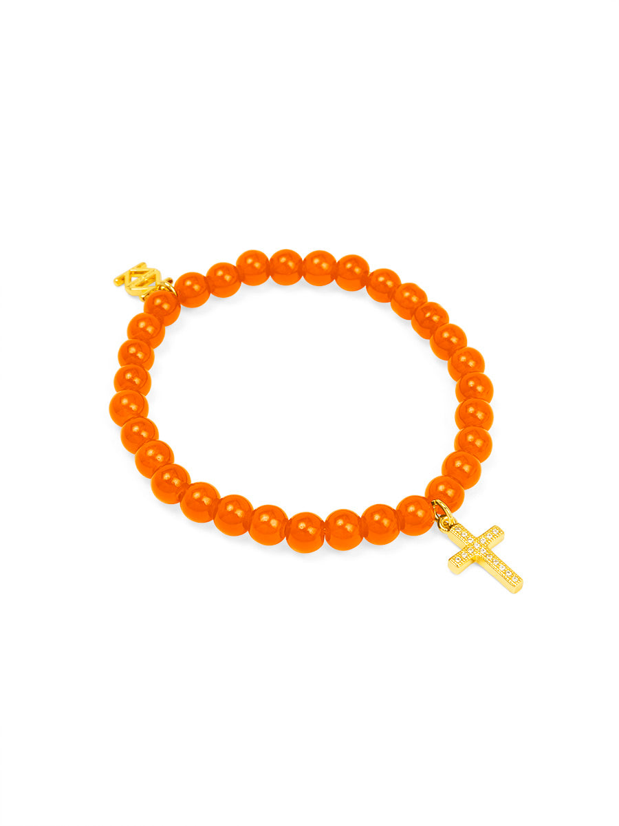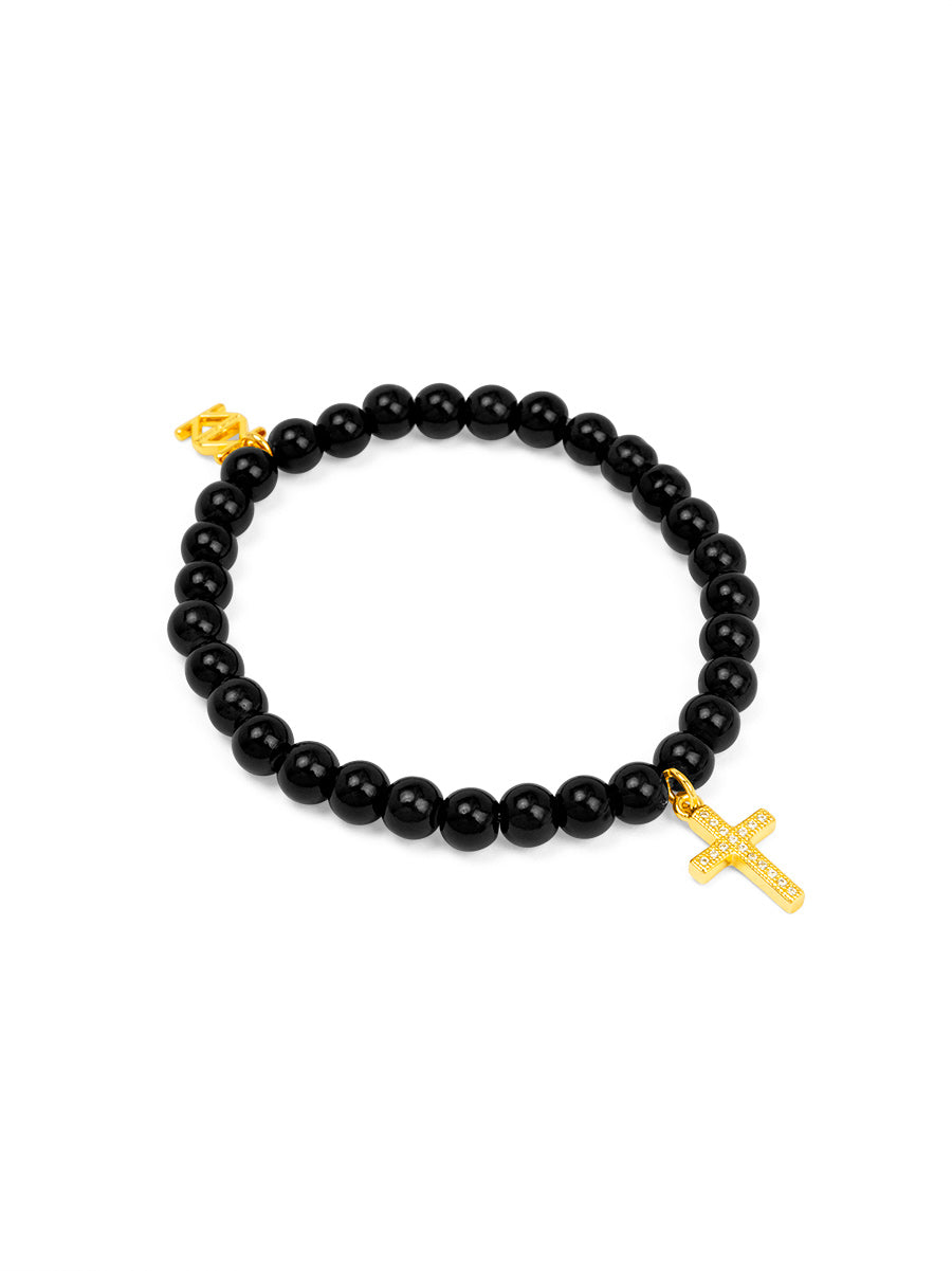 A stretch glass-bead bracelet accented with a small pavé cross charm.