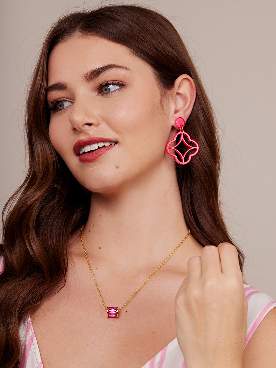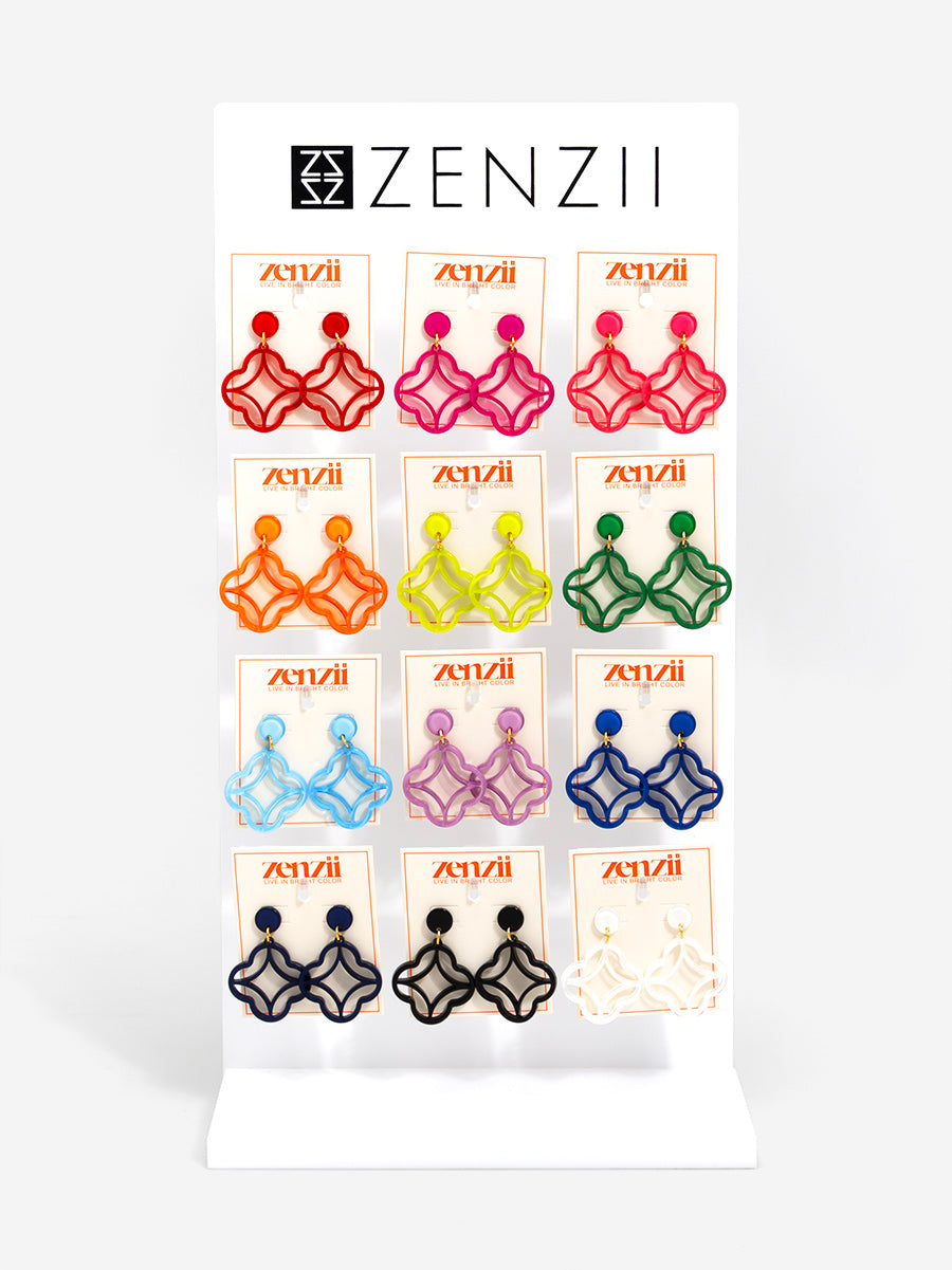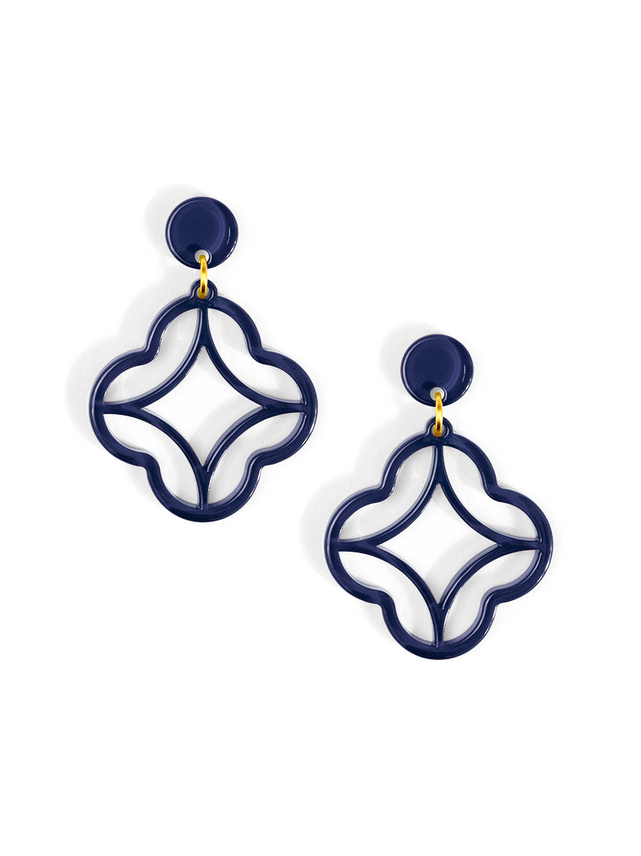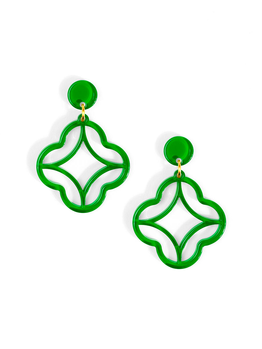 A modern stud-drop design featuring a star-shaped center wrapped in a clean quatrefoil frame. Polished, playful, and perfect for everyday color.