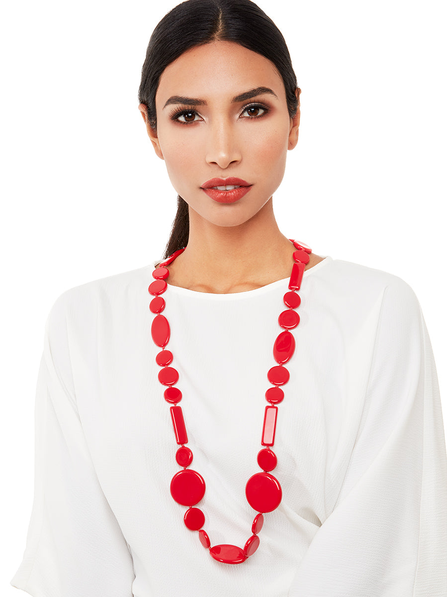 Long, resin necklace with beaded geometric shapes in a glossy finish.