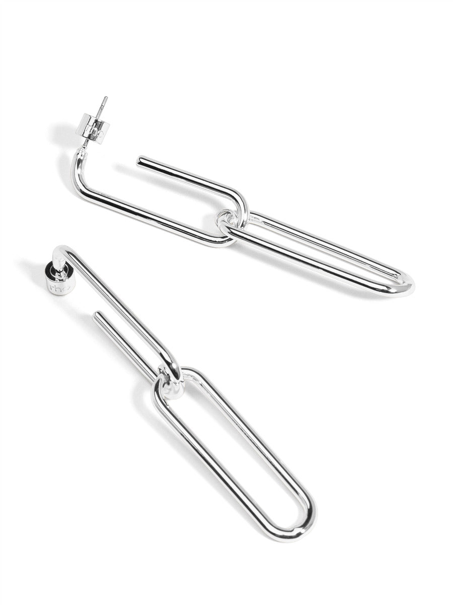 Drop earring composed of thin elongated paperclip links plated in 18K gold.