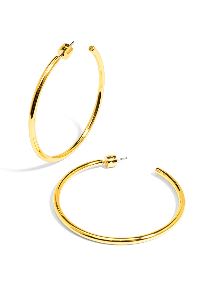 Large size thin hoop earring plated in 18K gold with a post-back closure.