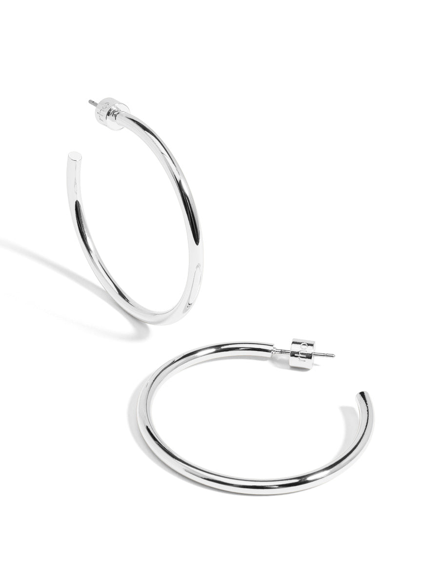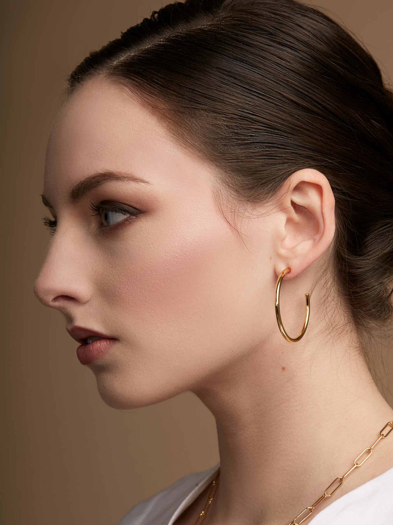 Medium size thin hoop earring plated in 18k gold with a post-back closure.