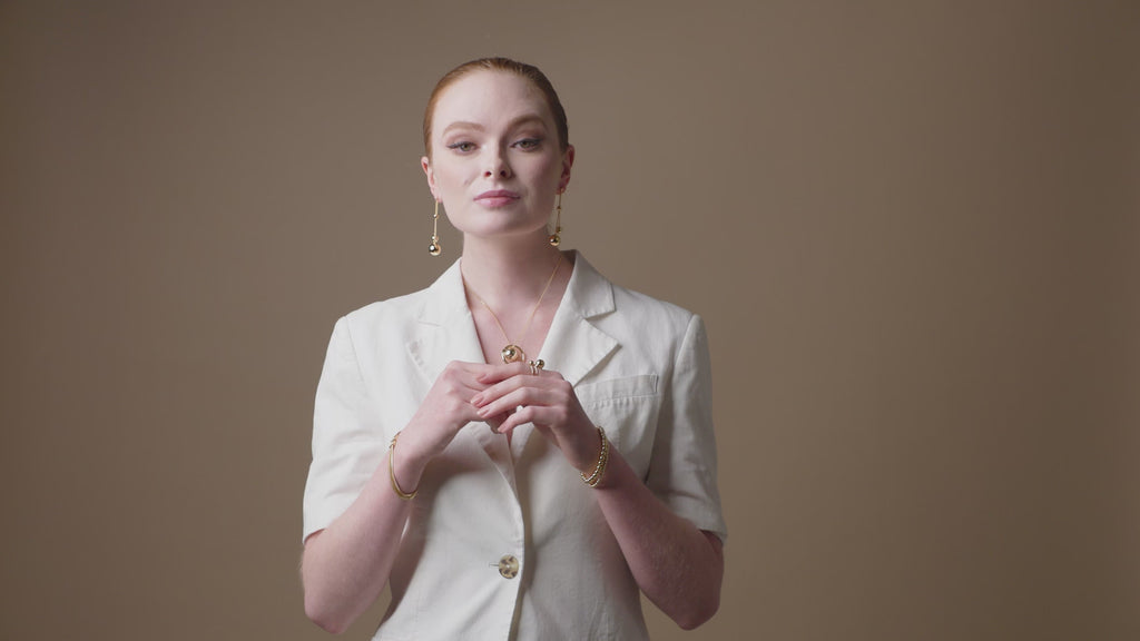 18k gold-plated drop earring featuring three orbs attached to a delicate chain.